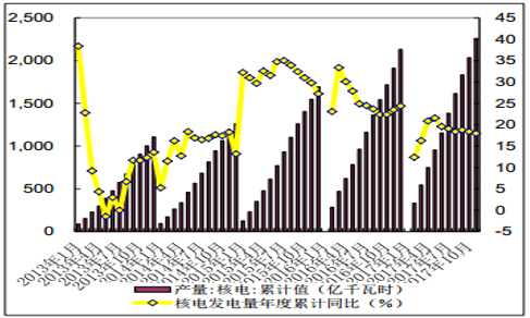 2017年11 月份,全國核電發(fā)電量 223 億千瓦時,同比增長 14.7%。 1-11月份,全國核電發(fā)電量 2259 億千瓦時,同比增長 18.0%,增速比上年同期回落 5.5 個百分點。