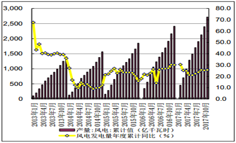 2017年11 月份,全國 6000 千瓦及以上風(fēng)電廠發(fā)電量 327 億千瓦時,同比增長 31.0%。 1-11 月份,全國 6000 千瓦及以上風(fēng)電廠發(fā)電量2717 億千瓦時,同比增長 25.6%,增速比上年同期回落 4.7 個百分點。