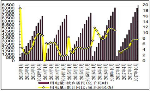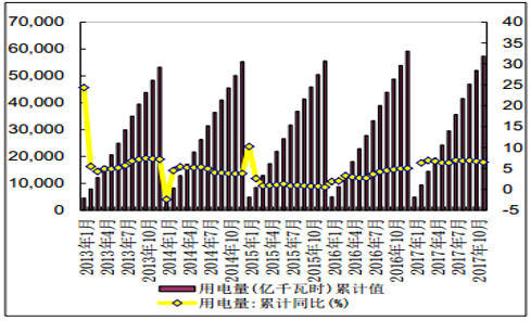 2017年1-11 月份,全國全社會用電量 57331 億千瓦時,同比增長 6.5%,增速比上年同期提高 1.5 個百分點。1-11 月份,第一產(chǎn)業(yè)用電量 1074 億千瓦時,同比增長 7.1%,占全社會用電量的比重為 1.9%;第二產(chǎn)業(yè)用電量 40185 億千瓦時,同比增長 5.5%,增速比上年同期提高 2.9 個百分點,占全社會用電量的比重為 70.1%,對全社會用電量增長的貢獻(xiàn)率為 59.8%;第三產(chǎn)業(yè)用電量 8054 億千瓦時,同比增長 10.5%,增速比上年同期回落1.1 個百分點,占全社會用電量的比重為 14.0%,對全社會用電量增長的貢獻(xiàn)率為 21.9%;城鄉(xiāng)居民生活用電量 8018 億千瓦時,同比增長 7.7%,增速比上年同期回落 3.8 個百分點,占全社會用電量的比重為 14.0%,對全社會用電量增長的貢獻(xiàn)率為 16.3%。