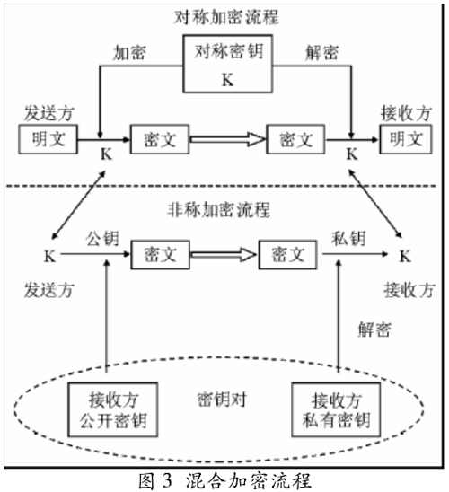 混合加密技術(shù)不是一種單一的加密技術(shù),而是一個(gè)結(jié)合體,是上述兩種數(shù)據(jù)加密技術(shù)相互結(jié)合的產(chǎn)物。通信雙方的通信過程分為兩個(gè)部分,雙方先利用非對(duì)稱加密技術(shù)傳送本次通信所用的對(duì)稱密鑰,然后再用對(duì)稱加密技術(shù)加密傳送文件?;旌霞用芰鞒倘鐖D3所示。