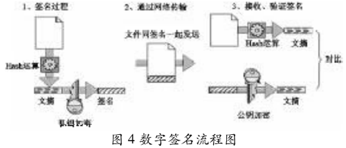 所謂”數(shù)字簽名”就是通過某種密碼運(yùn)算生成一系列符號(hào)及代碼組成電子密碼進(jìn)行簽名。數(shù)字簽名的概念由WhitfiedDiffie和MaitinHellman于1976年最先提出,目的是使簽名者對(duì)電子文件也可以進(jìn)行簽名并且無(wú)法否認(rèn),驗(yàn)證者無(wú)法篡改文件。數(shù)字簽名由簽名算法和驗(yàn)證算法構(gòu)成,數(shù)字簽名如圖4所示。