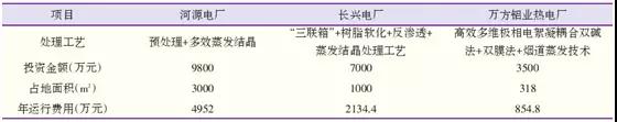 本次選取國內(nèi)已投運(yùn)的脫硫廢水“零排放”項(xiàng)目,項(xiàng)目采用不同的脫硫廢水“零排放”處理方案,其技術(shù)經(jīng)濟(jì)對(duì)比見表1。
