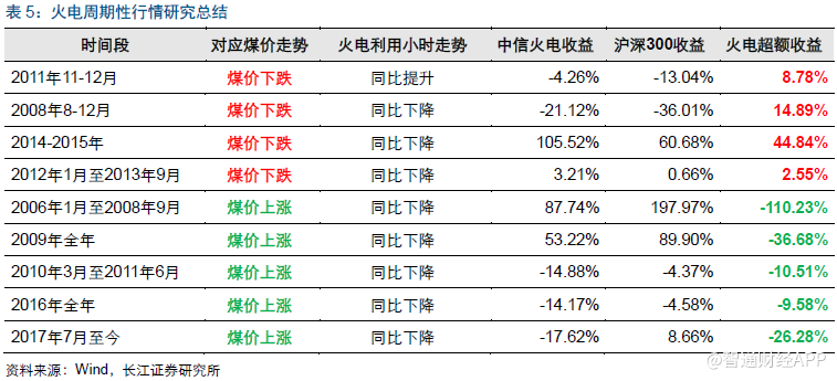 對(duì)于火電行業(yè)而言,雙周期力同時(shí)利好意味著:1)煤價(jià)處于下行周期中;2)利用小時(shí)處于同比提升的環(huán)境下。然而,歷史上這樣的時(shí)間非常少,主要原因系:火電利用小時(shí)的增長意味著火電發(fā)電量的提升,而火電發(fā)電量提升對(duì)于煤炭行業(yè)而言是下游需求的提升,對(duì)于煤價(jià)會(huì)有促進(jìn)作用。