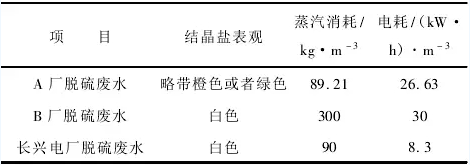 以蒸汽單價(jià)60元/m3計(jì)算,電價(jià)0.5元/(kW˙h)計(jì),脫硫廢水均以25 m3/h計(jì),與B廠脫硫廢水相比,長興電廠脫硫廢水零排放可節(jié)省513. 56萬元/a。與A廠脫硫廢水相比,可節(jié)省201.76萬元/a。