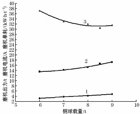 圖2 B磨機(jī)出力、電流、單耗與鋼球裝載量關(guān)系曲線