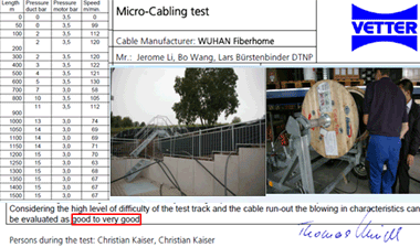 烽火科技新開(kāi)發(fā)出的96芯氣吹微纜的外徑僅為6.0mm。微纜的氣吹性能得到國(guó)外專業(yè)的氣吹測(cè)試機(jī)構(gòu)VETTER的認(rèn)證,具有氣吹效果優(yōu)良,氣吹距離一次可達(dá)1.5公里以上,平均速度可達(dá)80m/min。