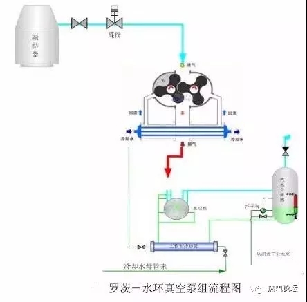 (8)真空泵系統(tǒng)。通常有2種方式來提高水環(huán)真空泵抽吸能力:一是采用深井水、中央空調冷媒水等冷卻方式降低真空泵的工作液溫度;二是加裝大氣噴射器或蒸汽噴射器提高真空泵入口壓力。近年來,部分機組使用羅茨-水環(huán)泵串聯(lián)抽真空技術,該設備采用羅茨泵抽吸凝汽器不凝結氣體,經(jīng)過冷卻器冷卻后再進入水環(huán)真空泵,通過以小代大的方式運行,節(jié)電明顯。