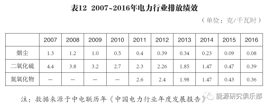 從污染物排放情況來(lái)看,下降趨勢(shì)是比較明顯的。煙塵排放總量由2007年的350萬(wàn)噸下降到2016年的35萬(wàn)噸,排放績(jī)效由每千瓦時(shí)1.3克下降到0.08克;二氧化硫排放總量由2007年的1200萬(wàn)噸下降到2016年的約177萬(wàn)噸,排放績(jī)效由每千瓦時(shí)4.4克下降到0.39克;氮氧化物“十二五”期間始有數(shù)據(jù)公布,2012年排放總量948萬(wàn)噸、排放績(jī)效2.4克/千瓦時(shí),快速降至2016年155萬(wàn)噸、0.36克/千瓦時(shí)。