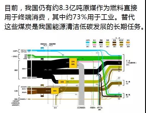?根據(jù)對能流圖的分析,2017年,我國電能占終端能源消費的比重同比提高1個百分點,但仍有約8.3億噸原煤作為燃料直接用于終端消費,其中約73%用于工業(yè)。替代這些煤炭是我國能源清潔低碳發(fā)展的長期任務(wù)。