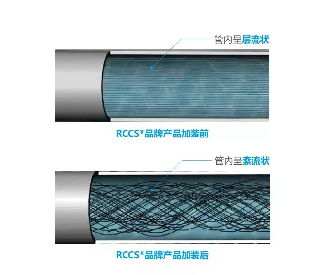 通過安裝RCCS品牌產(chǎn)品可將換熱管內(nèi)工質(zhì)由層流狀態(tài)(或輕度紊流狀態(tài))改變?yōu)楦邚?qiáng)度紊流狀態(tài),打破邊界滯留層及溫度場(chǎng)的不均勻分布,從而實(shí)現(xiàn)強(qiáng)化換熱功效,在設(shè)計(jì)思想上擺脫了傳統(tǒng)的被動(dòng)清洗除垢概念,變被動(dòng)除垢為主動(dòng)防垢。