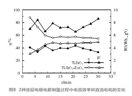由圖8可知,Ti/IrO2涂層電極的電流效率和直流電耗分別為40%、7.9 kW.h/kg,Ti/IrO2-RuO2涂層 電極的分別為60%、4.5 kW.h/kg。Ti/IrO2涂層電極的電流效率明顯低于Ti/IrO2-RuO2涂層電極,直流電耗大大高于Ti/IrO2-RuO2涂層電極。原因是Ti/ IrO2涂層電極析氯反應(yīng)進(jìn)行得較差,隨著電解液中Cl-含量下降導(dǎo)致傳質(zhì)效率下降,電流效率開始逐步 下降,直流電耗逐漸升高。電解過程中電解液溫度略 有升高也是一個(gè)原因。