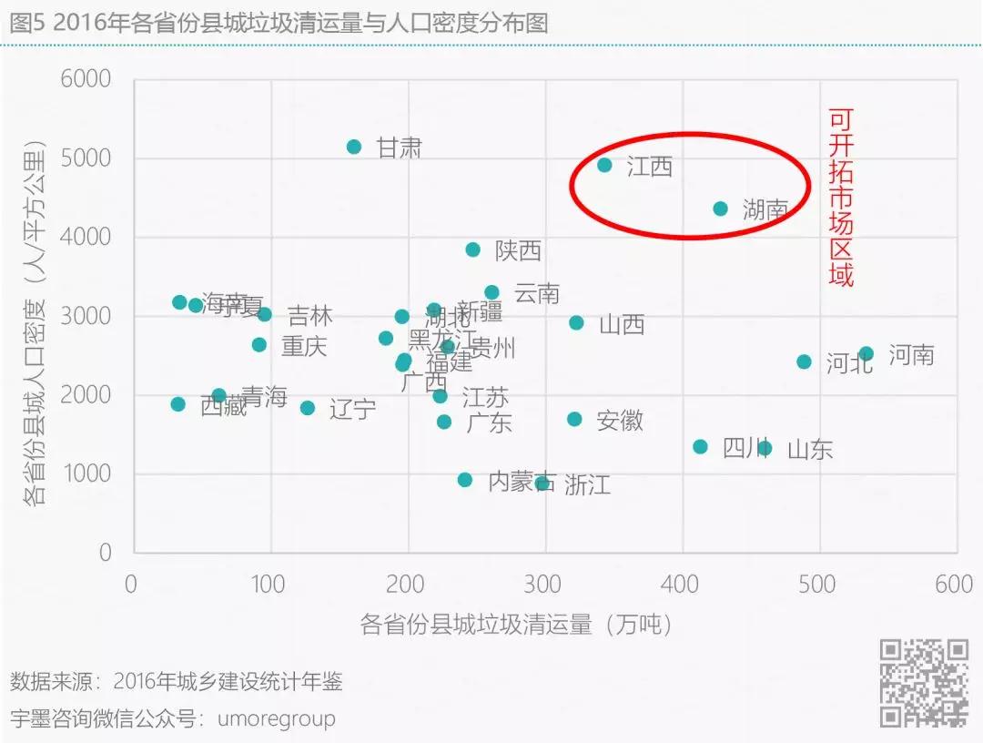 接下來從各省份縣域維度分析,從城建部的數(shù)據(jù)來看全國各個省份的生活垃圾無害化處置率基本都維持在70%以上,但是除了上海、江蘇、浙江、安徽、山東、寧夏這六個省市區(qū)外,其余地區(qū)焚燒處置垃圾比率均不足10%(圖4),而甘肅、江西、湖南三個省份縣城人口密度最高,焚燒比率缺口相對較大。另一方面,一個地區(qū)的垃圾清運量理應與地區(qū)的人口密度成正比,但是由于中國縣級以下地區(qū)人口遷移度大,戶籍人口密度與常住人口密度出入存在一定差異,因此從圖6可看在甘肅地區(qū)垃圾清運較低但人口密度偏高的地區(qū),人口外流比例會相對較高,當然這里也不排除各地市人均垃圾產(chǎn)生量有較大差異。宇墨通過對各省份縣城垃圾清運量與各省份縣城人口密度分布的分析(圖5),推斷在人口密度相對高且垃圾產(chǎn)生量相對較多的江西和湖南兩省份的縣城區(qū)域開辟垃圾焚燒發(fā)電市場相對較容易,而在這些省份縣城中那些旅游景區(qū)及高校等區(qū)域或有更多的垃圾供給。畢竟對于縣級鄉(xiāng)級地市建設垃圾焚燒發(fā)電廠有一大難題,當焚燒廠建好后,由于垃圾產(chǎn)生量不足而造成的垃圾發(fā)電廠無法長期運營的情況對企業(yè)來說乃是硬傷,且在《“十三五”全國城鎮(zhèn)生活垃圾無害化處理設施建設規(guī)劃》中已提出不鼓勵建設處理規(guī)模小于300噸/日的焚燒設施。對于想要進軍縣級區(qū)域開辟市場的企業(yè)來說,如何有效收集垃圾以及降低收運成本使得焚燒廠實現(xiàn)滿負荷工作將是主要考慮因素。