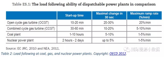 由上表可見,單循環(huán)燃氣輪機(OCGT)發(fā)電可在10-20分鐘啟動,“爬坡率”可達20%/分鐘;聯合循環(huán)電廠(CCGT)可在30-60分鐘內啟動,爬坡率為5-10%/分鐘;煤電廠啟動時間要1-10小時,爬坡率1-5%/分鐘;而核電廠啟動時間需要2小時-2天,爬坡率1-5%/分鐘。