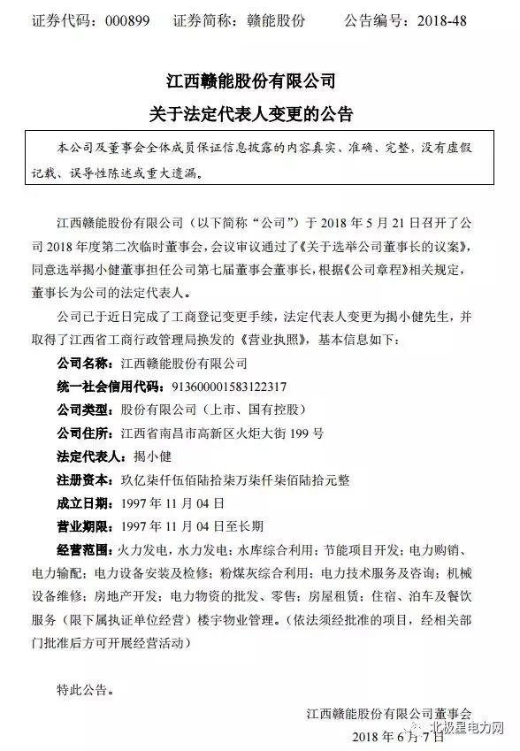6月7日,贛能股份發(fā)布了關(guān)于法定代表人變更的公告。贛能股份已于近日完成了工商登記變更手續(xù),揭小健任第七屆董事會(huì)董事長(zhǎng),公司法定代表人變更為揭小健先生,并取得了江西省工商行政管理局換發(fā)的《營(yíng)業(yè)執(zhí)照》。