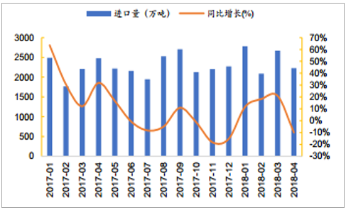 國內(nèi)供應(yīng)方面, 4 月份全國原煤產(chǎn)量 2.93 億噸,同比增長(zhǎng) 4.1%。 1-4月全國原煤累計(jì)產(chǎn)量 11.0 億噸,同比增長(zhǎng) 3.8%。 4 月份國有重點(diǎn)煤礦產(chǎn)量 1.54 億噸,同比增加 724 萬噸,增長(zhǎng) 4.9%。 1-4 月國有重點(diǎn)煤礦產(chǎn)量累計(jì) 6.07 億噸,同比增加 2551 萬噸,增長(zhǎng) 4.4%。國際貿(mào)易方面, 4 月份,全國煤炭進(jìn)口 2228.3 萬噸,同比減少 250萬噸,下降 11.3%。 1-4 月累計(jì)進(jìn)口煤炭 9767.7 萬噸,同比增加 830.3 萬噸,增長(zhǎng) 9.3%。煤炭出口方面, 4 月份煤炭出口量為 51.1 萬噸,同比減少 37.9 萬噸,下降 42.6%。 1-4 月累計(jì)出口 147.9 萬噸,同比減少 176.8 萬噸,下降 54.5%。