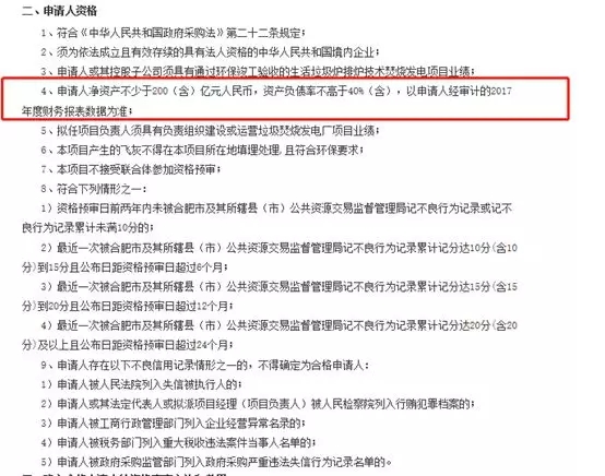 其中,第四條要求:“申請人凈資產不少于200(含)億元人民幣,資產負債率不高于40%(含)”。不難發(fā)現(xiàn),這條資格線門檻不低,不僅要求“凈資產不少于200(億)元人民幣”,同時,還要求“負債率不高于40%”。這意味著諸如光大國際、中國天楹、啟迪桑德、偉明環(huán)保、上海環(huán)境、錦江環(huán)境、瀚藍環(huán)境等國內龍頭固廢企業(yè),也未必可以達到這一要求。也就是說,這樣一條資格預審線,可能攔下一大批固廢行業(yè)的領先企業(yè)們。