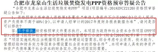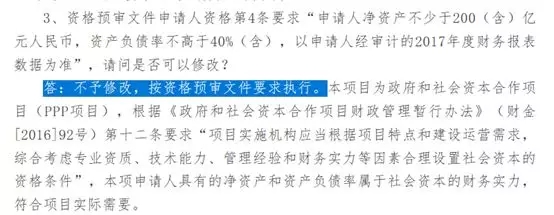 針對資格預審條件設置可能存在的疑問,5月21日,招標方發(fā)布公告進行了答疑,其中,第四條給出的答案是:“不予修改,按資格預審文件要求執(zhí)行。”,給出的理由是:“本項目為政府和社會資本合作項目(PPP項目),根據(jù)《政府和社會資本合作項目財政管理暫行辦法》(財金[2016]92號)第十二條要求“項目實施機構應當根據(jù)項目特點和建設運營需求,綜合考慮專業(yè)資質、技術能力、管理經驗和財務實力等因素合理設置社會資本的資格條件”,本項申請人具有的凈資產和資產負債率屬于社會資本的財務實力,符合項目實際需要。”