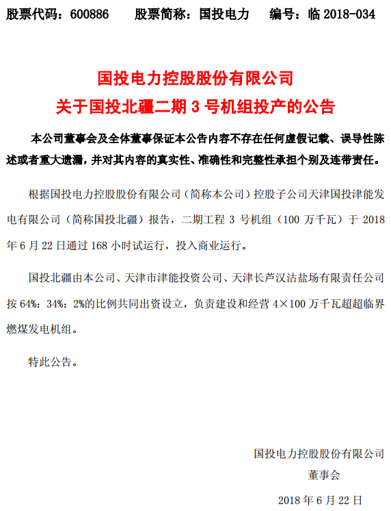 6月22日國投電力發(fā)布公告,公司控股子公司國投北疆二期工程3號機(jī)組(100萬千瓦)于6月22日通過168小時(shí)試運(yùn)行,投入商業(yè)運(yùn)行。