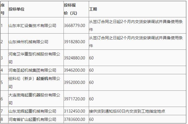 中標(biāo)單位:山東豐匯設(shè)備技術(shù)有限公司中標(biāo)價(jià):3668779.00元(中標(biāo)價(jià)為投標(biāo)總報(bào)價(jià))暫估價(jià):0元暫列金額:0元中標(biāo)工期:從簽訂合同之日起2個月內(nèi)交貨安裝調(diào)試并具備使用條件日歷天質(zhì)量標(biāo)準(zhǔn):起重機(jī)質(zhì)保期2年,其中易損件壽命保證3年。項(xiàng)目規(guī)模:400其他公示說明:公示時(shí)間:2018年6月26日0時(shí)0分-2018年6月28日0時(shí)0分投訴電話:0531-689670102018年6月26日
