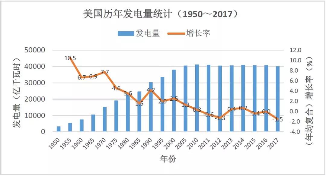 美國(guó)本土未受到二戰(zhàn)破壞,自1950年以來(lái),發(fā)電量持續(xù)增長(zhǎng)。一直到1970年,折合年均復(fù)合增長(zhǎng)率都大于6.5%(注:本文的折合年均復(fù)合增長(zhǎng)率,是對(duì)多年度數(shù)據(jù)的一種處理,如兩個(gè)數(shù)據(jù)跨N年,則計(jì)算這N年的年均復(fù)合增長(zhǎng)率。后面數(shù)據(jù)如再跨M年,則再另行計(jì)算這后M年的復(fù)合增長(zhǎng)率。下文同)??傮w來(lái)說(shuō),在過(guò)去的70年里,美國(guó)的發(fā)電量增速是下降的,近十年來(lái)部分年份是負(fù)增長(zhǎng)的。從2005年站上4萬(wàn)億千瓦時(shí)以后,基本不再增長(zhǎng),2010年達(dá)到歷史峰值4.125萬(wàn)億千瓦時(shí),2017年為4.015萬(wàn)億千瓦時(shí)。