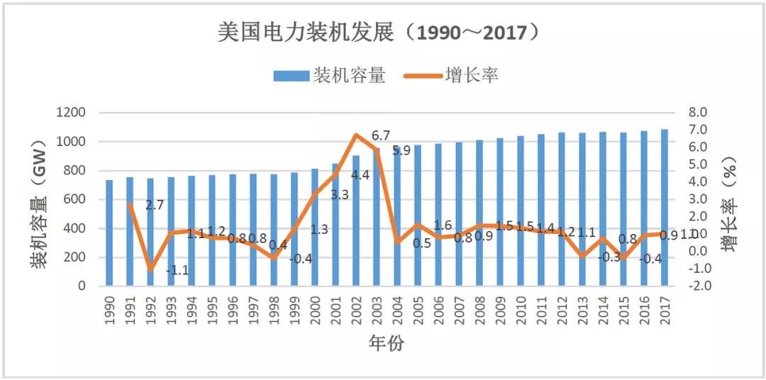 我們可以看到,美國(guó)的發(fā)電裝機(jī)到1990年已經(jīng)發(fā)展到了很穩(wěn)定的階段。除了2002~2003年這4年發(fā)展較快之外(2002年增長(zhǎng)6.7%為最增長(zhǎng)率),其余年份,基本處于穩(wěn)定狀態(tài),自2008年突破10億千瓦,截至2017年(10.85億)仍未能突破11億千瓦。