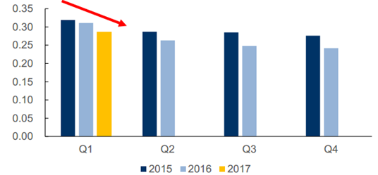 國投電力水電平均上網(wǎng)電價(jià)呈下降趨勢(單位:元/度)