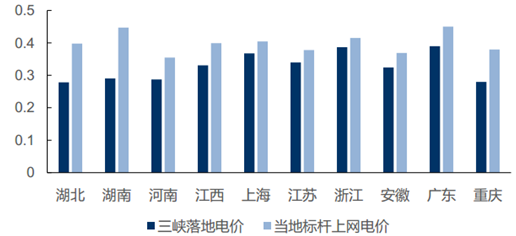三峽水電落地電價(jià)與多個(gè)省份當(dāng)?shù)鼗痣姌?biāo)桿電價(jià)對比