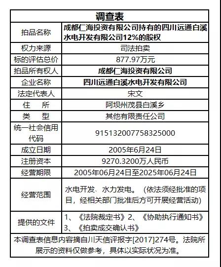 拍賣 | 成都仁海投資公司持有的四川遠通白溪水電開發(fā)公司12%的股權 11月2日第二次開拍