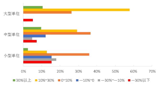 相對(duì)而言,大型單位面對(duì)市場(chǎng)環(huán)境變化,其抗壓能力和應(yīng)變能力較強(qiáng),則能保持較高的增速;中型單位基本能維持增長(zhǎng);而小型單位由于市場(chǎng)競(jìng)爭(zhēng)能力、抗壓能力、抗風(fēng)險(xiǎn)能力相對(duì)較弱,其受到市場(chǎng)環(huán)境變化的影響相對(duì)較大一些,故營(yíng)業(yè)收入出現(xiàn)較大幅度下降的也以小型單位居多。