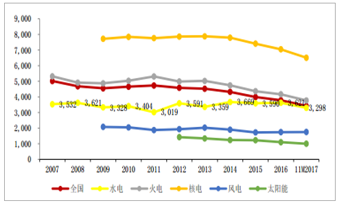 根據(jù)能源局于2016年12月份發(fā)布的“能源發(fā)展十三五規(guī)劃”,2020年我國裝機容量目標為2000GW左右。其中:1.煤電裝機規(guī)??刂圃?100GW以內(nèi),取消一批、緩建一批和停建煤電項目,新增投產(chǎn)規(guī)模控制在200GW以內(nèi)。2.常規(guī)水電規(guī)模達到340GW,外加大型抽水蓄能水電站在運規(guī)模達到40GW。3.核電在運裝機規(guī)模達到58GW,在建規(guī)模達到30GW。4.風電裝機規(guī)模達到210GW以上。5.光伏裝機規(guī)模達到110GW,其中分布式光伏60GW、光伏電站45GW、光熱發(fā)電5GW。光伏發(fā)電力爭實現(xiàn)用戶側(cè)平價上網(wǎng)。從裝機規(guī)模來看,截至11M2017,我國總裝機規(guī)模達1679GW,2020年目標為2000GW,2018-2020年CAGR達6.0%。從裝機結構來看,我國目前以及2020年依舊是火電為主體,11M2017為64.8%,至2020年將微降至60.5%。水電為裝機占比第二大的電力種類,11M2017為17.6%,至2020年將微升至19.0%。