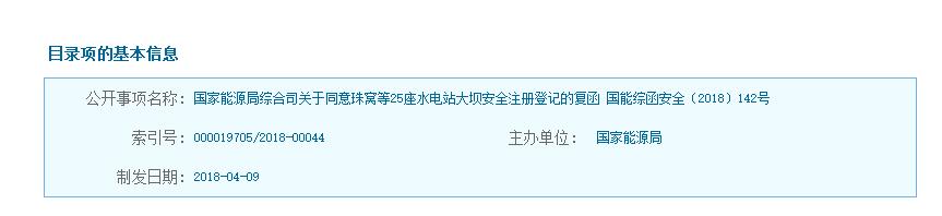 從國(guó)家能源局了解到,能源局同意珠窩等25座水電站安全注冊(cè)登記。