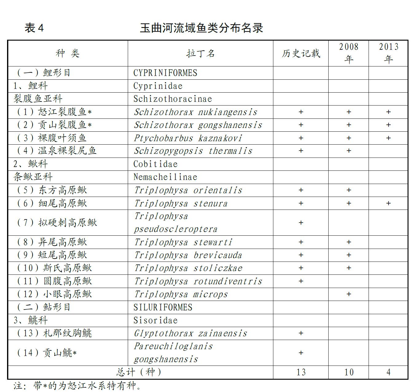 調(diào)查區(qū)域內(nèi)裸腹葉須魚(Ptychobarbus kaznakovi)是唯一被列入《中國物種紅色名錄》的魚類,裸腹葉須魚為中國特有,主要分布在青海、四川、西藏,過度捕撈和生態(tài)環(huán)境破壞是致危的主因。但在玉曲河流域裸腹葉須魚資源較為豐富,是當(dāng)?shù)氐闹饕?jīng)濟魚類之一。