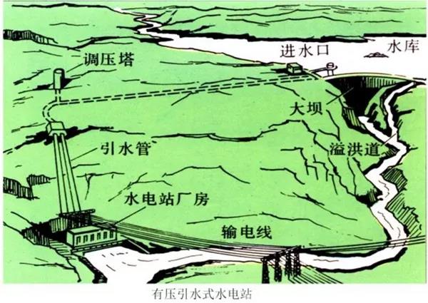 在河流坡降陡的河段上筑一低壩(或無壩)取水,通過人工修建的引水道(渠道、隧洞、管道)引水到河段下游,集中落差,再經壓力管道引水到水輪機進行發(fā)電。用引水道集中水頭的電站稱為引水式水電站。