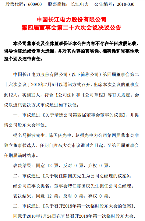 中國(guó)長(zhǎng)江電力股份有限公司發(fā)布第四屆董事會(huì)第二十六次會(huì)議決議公告,?提名馬振波先生、陳國(guó)慶先生、趙強(qiáng)先生為公司第四屆董事會(huì)非獨(dú)立董事候選人,任期自股東大會(huì)審議通過(guò)之日起,至第四屆董事會(huì)任期屆滿時(shí)結(jié)束;聘任陳國(guó)慶先生擔(dān)任公司總經(jīng)理。