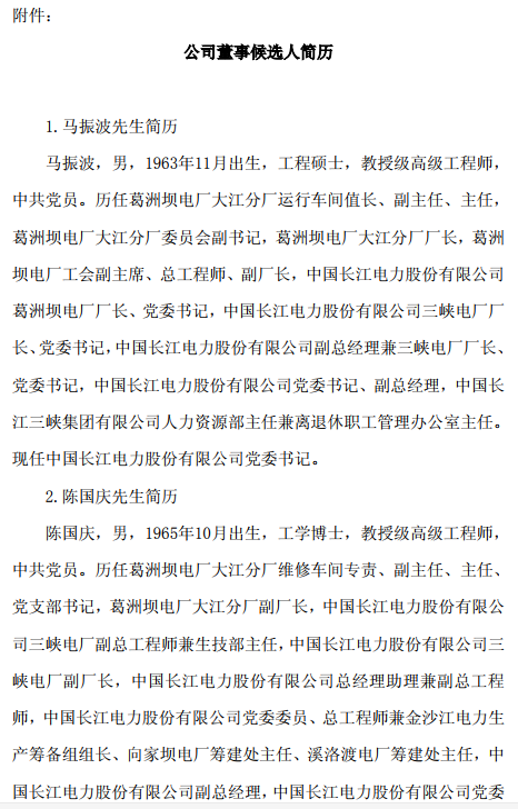 長(zhǎng)江電力聘任陳國(guó)慶先生為公司總經(jīng)理