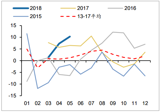 2018年1-5月,全國(guó)火電發(fā)電量同比增長(zhǎng)8.1%(13-17年間平均增速為1.4%),增速較去年 同期增長(zhǎng)0.9個(gè)百分點(diǎn)。5月當(dāng)月發(fā)電量同比增長(zhǎng)10.3%(13-17年間平均增速為1.2%), 增速較去年同期增長(zhǎng)3.8個(gè)百分點(diǎn)。