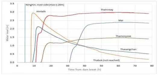 分析表明,潰壩發(fā)生后,初期由于坡降大,洪水演進(jìn)速度非???到達(dá)平坦地區(qū)后,演進(jìn)速度大大降低。潰壩洪水到達(dá)的第一個(gè)重要位置(即Hinlath)的歷時(shí)約為8小時(shí),淹沒水深為12米;18小時(shí)后達(dá)到Thabok,水深6.8米。下表給出了受影響最大的區(qū)域的洪水到達(dá)時(shí)間和最大淹沒水深,以及根據(jù)計(jì)算得出的洪水消落速率。