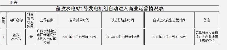 各電力企業(yè):現(xiàn)將蓋孜水電站1號(hào)發(fā)電機(jī)組自動(dòng)進(jìn)入商業(yè)運(yùn)營(yíng)情況(具體見(jiàn)附表)予以公示,公示期5個(gè)工作日(自2018年3月6日起至2018年3月12日