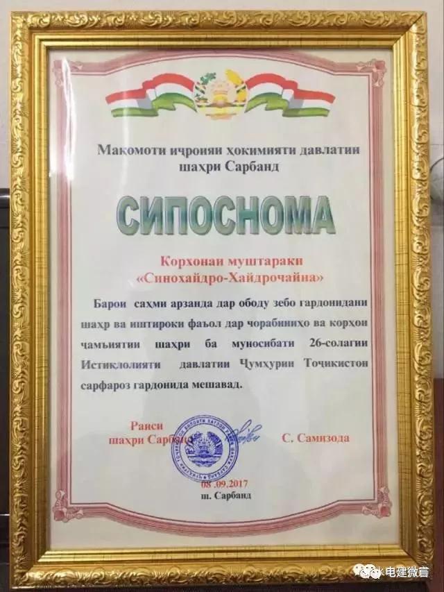 2017年9月,項目部榮獲塔吉克斯坦民族獨立貢獻先進單位榮譽證書。