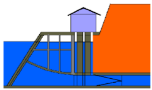 ②塔式進(jìn)水口:位于水工隧洞或土石壩壩下埋管的首部,是一個(gè)不依傍山坡,獨(dú)立于水庫之中的封閉式塔或框架式塔,又稱進(jìn)水塔。塔底裝設(shè)閘門,在塔內(nèi)或頂部布置啟閉機(jī)室。塔式進(jìn)水口受風(fēng)、浪、冰和地震的影響大,穩(wěn)定性不如豎井式,需要較長的工作橋與岸邊或壩頂連接。適用于岸坡低緩、巖石破碎或覆蓋層較厚,不宜采用靠岸進(jìn)口的情況。