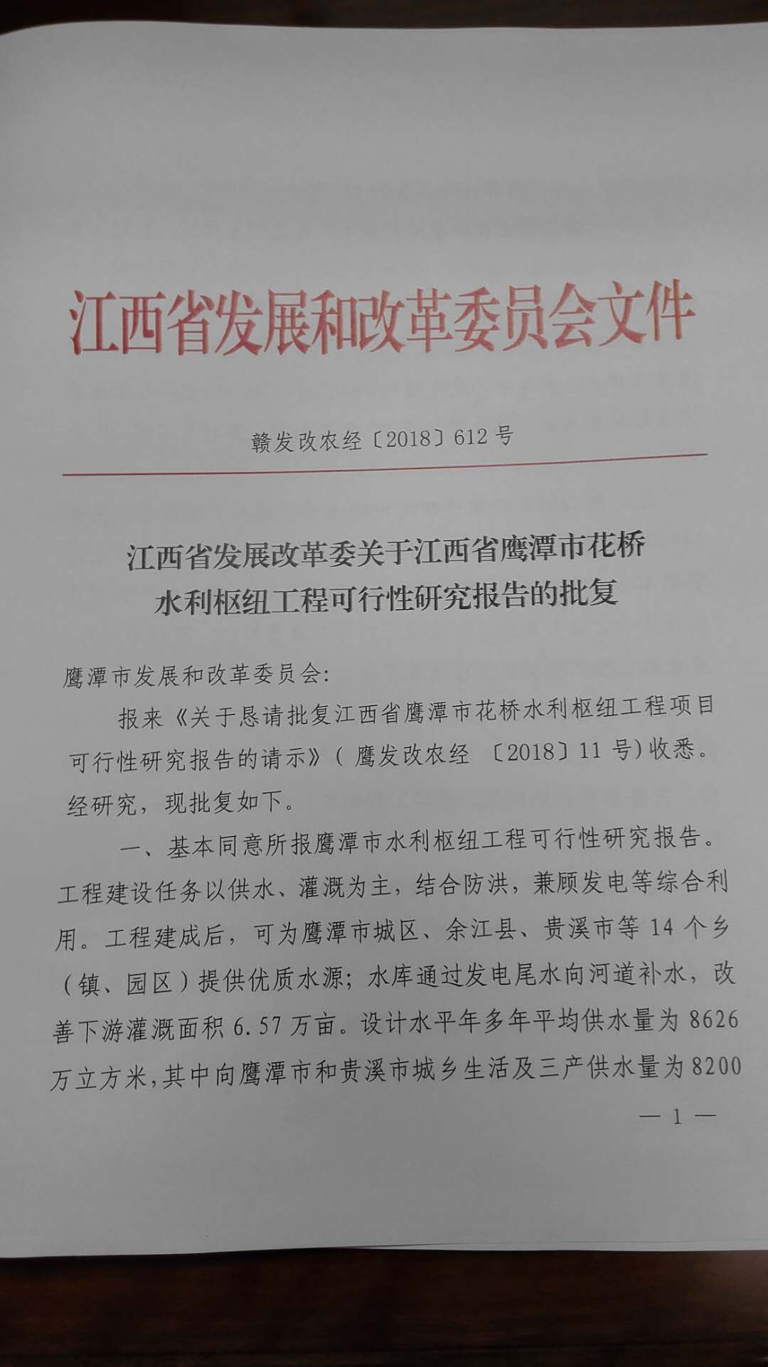 我委在市政府的高度重視和省發(fā)改委的大力支持下,期盼已久的批復(fù)《江西省鷹潭市花橋水利樞紐工程項(xiàng)目可行性研究報(bào)告》,于2018年7月2日獲省發(fā)改委批復(fù)。該項(xiàng)目總投資248164萬元。
