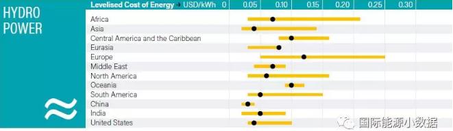 由上表可見(jiàn),水電的全生命周期內(nèi)平準(zhǔn)成本在印度最低,其次是中國(guó)、美國(guó)、南美;歐洲平準(zhǔn)成本最高,其次是大洋洲、中美洲。