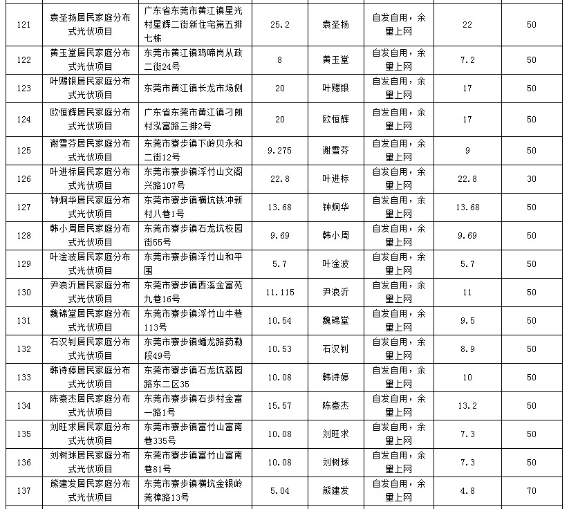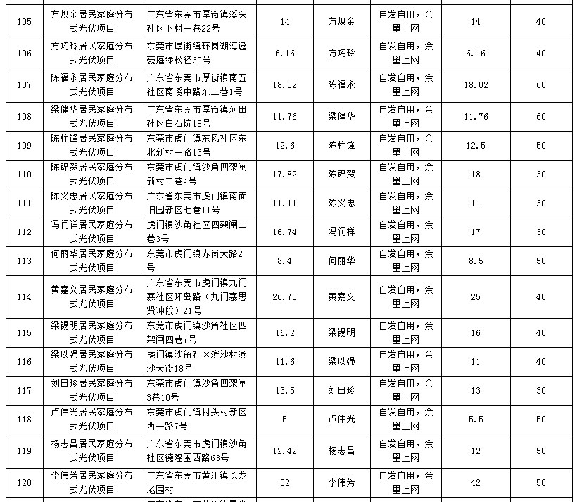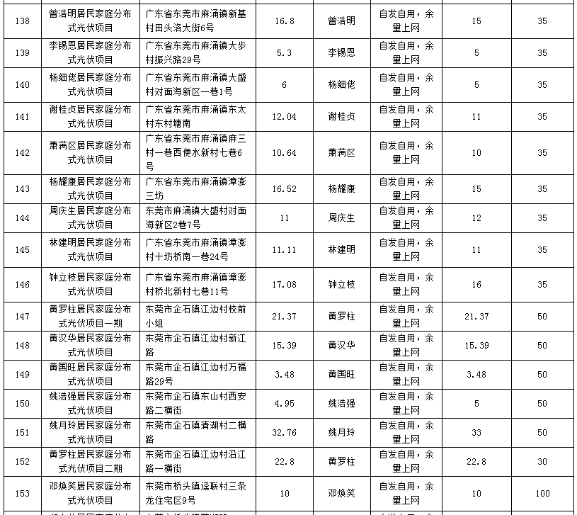 廣東東莞224個(gè)家庭分布式光伏項(xiàng)目備案信息表