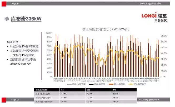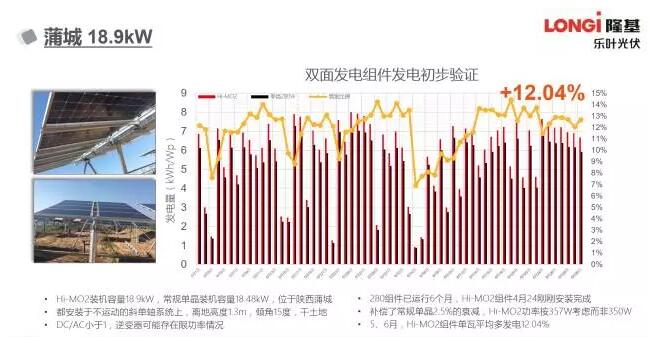 隆基樂葉在草和土的混合地面條件下,在組件安裝高度1.3米時,在17年5~6月雙面PERC組件相對常規(guī)單晶多發(fā)電比例為12%。而在庫布奇336kW的客戶項目中,雙面組件配合跟蹤支架在6~8月實現了40%左右的發(fā)電量提升(相對常規(guī)多晶)。