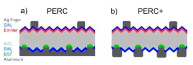 在2015年,SolarWorld與其合作研究結構ISFH報道了雙面PERC(PERC+)產品,其電池背面使用了局部鋁柵線,取得了與單面電池相當的正面轉換效率,雙面率達到65%。相比之前出現的雙面電池,沒有使用高成本的銀柵線與N型硅片,也沒有背面擴散環(huán)節(jié),電池成本與單面PERC電池成本相當,展現出非常好的應用前景。
