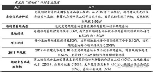 第三批“領(lǐng)跑者”計(jì)劃公布。2017年9月22日,國(guó)家能源局發(fā)布《關(guān)于推進(jìn)光伏發(fā)電“領(lǐng)跑者”計(jì)劃實(shí)施和2017年領(lǐng)跑基地建設(shè)有關(guān)要求的通知》,光伏發(fā)電領(lǐng)跑基地包括應(yīng)用領(lǐng)跑基地和技術(shù)領(lǐng)跑基地,每期領(lǐng)跑基地控制規(guī)模為8GW,其中應(yīng)用領(lǐng)跑基地和技術(shù)領(lǐng)跑基地規(guī)模分別不超過6.5GW和1.5GW。每個(gè)基地每期建設(shè)規(guī)模0.5GW,應(yīng)用領(lǐng)跑基地每個(gè)項(xiàng)目規(guī)模不小于0.1GW,技術(shù)領(lǐng)跑基地每個(gè)項(xiàng)目規(guī)模為0.25GW,2017年擬建設(shè)不超過10個(gè)應(yīng)用領(lǐng)跑基地和3個(gè)技術(shù)領(lǐng)跑基地,對(duì)應(yīng)規(guī)模不超過6.5GW,剩余的1.5GW指標(biāo)作為激勵(lì)預(yù)留規(guī)模。
