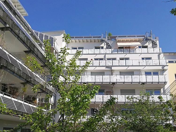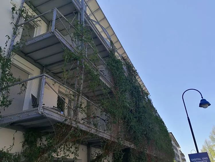 右側(cè)樓宇頂樓立面安裝了光伏,朝向為西。2-6層的陽臺上是頭像。