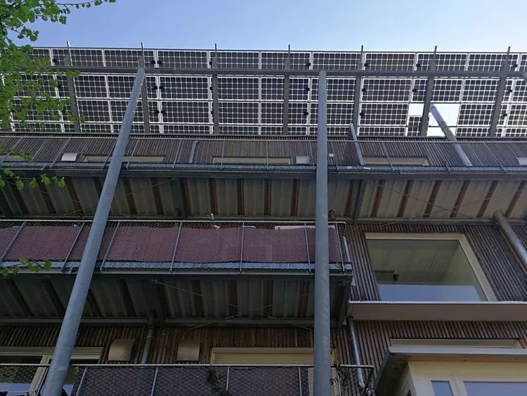 這是用普通的多晶硅光伏板做的南立面光伏。當(dāng)然,屋頂上也安裝了光伏。