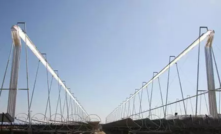 槽式與菲涅爾式發(fā)電系統(tǒng)的結(jié)構(gòu)部件簡單,易于實現(xiàn)工業(yè)標(biāo)準(zhǔn)化批量生產(chǎn)和安裝。對太陽的跟蹤系統(tǒng)通常采取單軸跟蹤系統(tǒng),跟蹤裝置較為簡化。但其聚光比小,傳熱介質(zhì)一般只能加熱到四五百度,且抗風(fēng)性略差。