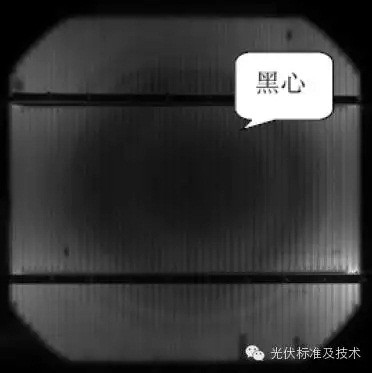 (1)產(chǎn)生原因:在直拉硅棒生產(chǎn)過程中,晶體定向凝固時(shí)間縮短,熔體潛熱釋放與熱場(chǎng)溫度梯度失配,晶體生長(zhǎng)速率加快,過大的熱應(yīng)力導(dǎo)致硅片內(nèi)部位錯(cuò)缺陷。(2)成像特點(diǎn):黑芯或黑團(tuán)片在EL成像圖中可以清晰的看到從電池片中心到邊緣逐漸變亮的同心圓,從而導(dǎo)致缺陷的部分在EL測(cè)試過程中表現(xiàn)為發(fā)光強(qiáng)度較弱或不發(fā)光。從而形成復(fù)合密集區(qū),在通電情況下電池片中心一圈呈現(xiàn)黑色區(qū)域。如圖4、5所示。(3)組件影響:組件出現(xiàn)此缺陷后,長(zhǎng)時(shí)間運(yùn)行,會(huì)造成熱擊穿;在使用組件測(cè)試儀測(cè)試組件IV測(cè)試特性曲線時(shí),測(cè)試曲線呈現(xiàn)臺(tái)階形狀;同時(shí)長(zhǎng)時(shí)間運(yùn)行會(huì)導(dǎo)致組件功率下降。